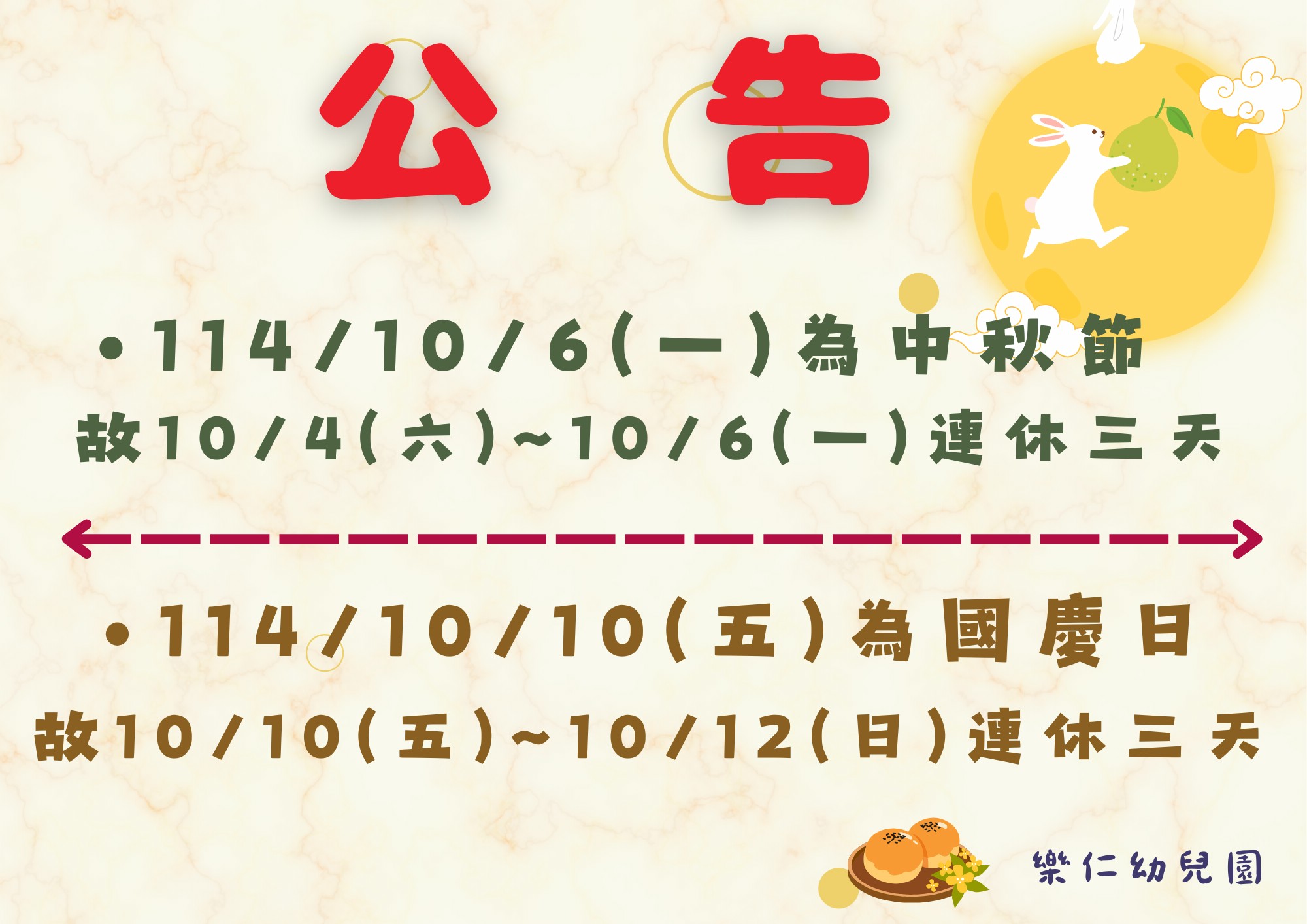 【放假公告】中秋節(連休三日)、國慶日(連休三日)
